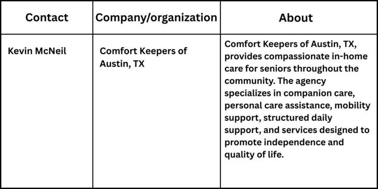 “We understand that starting companion care can feel overwhelming for families,” said Kevin McNeil, owner of Comfort Keepers of Austin, TX. “Our team takes time to walk through each step, answer questions clearly, and help families feel confident about the decisions they are making for their loved ones.”