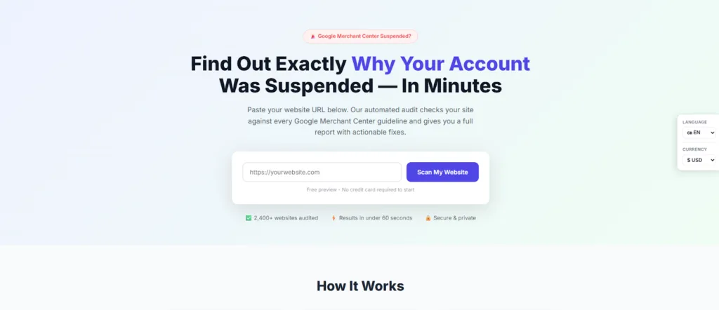 GMCSuspension.com is an automated audit tool for online merchants dealing with Google Merchant Center suspensions. The tool checks 43+ compliance factors in under 60 seconds and delivers actionable fix instructions based on Google’s policies. GMCSuspension.com is not affiliated with Google LLC.