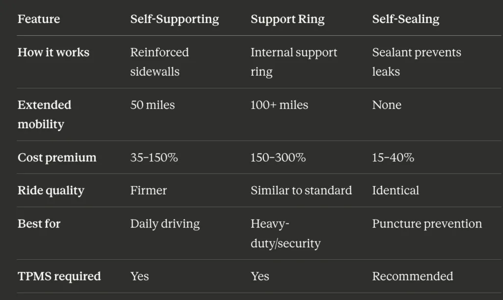 Critical Limitation: Self-sealing tires have NO reinforced sidewalls. They prevent flats from happening but provide zero extended mobility after a blowout or sidewall puncture. They solve a different problem than run flats.
