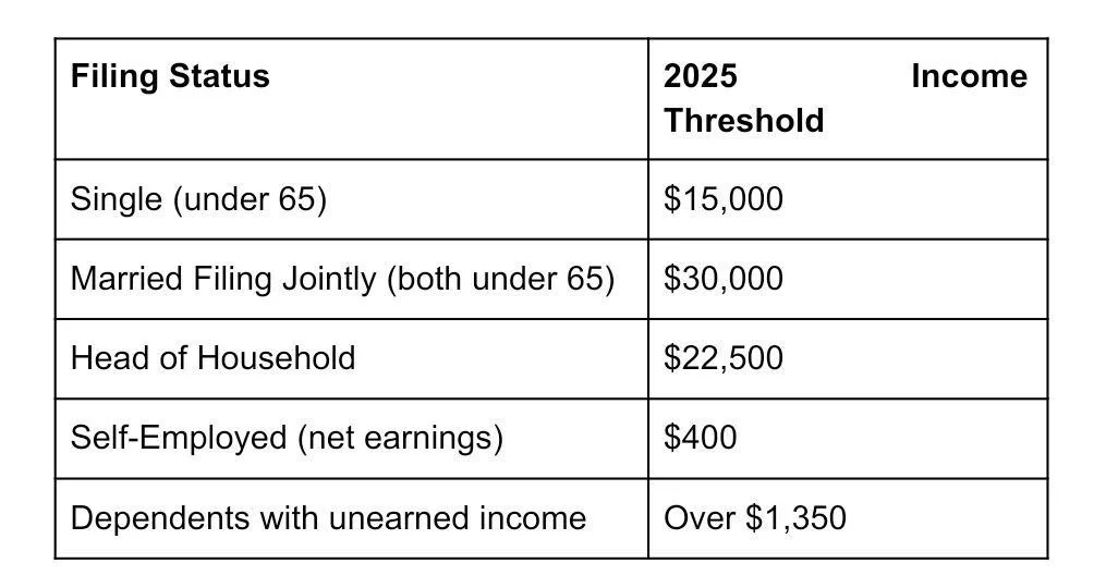 For the 2025 tax year, if a person’s gross income is at least equal to the standard deduction, that person must file. The following reflects this situation: