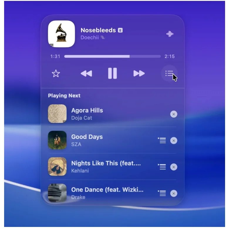 The miniplayer provides quick access to essential playback controls, including play, pause, skip, and volume adjustment. As an Apple Music miniplayer for Mac, Liqoria supports key features such as the Apple Music queue, search, playlists, AirPlay, and lyrics.