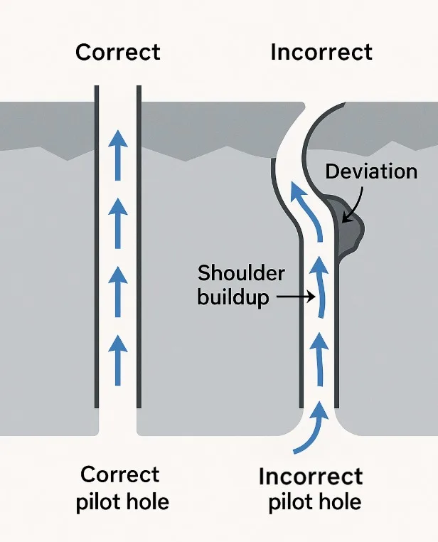 Most hole problems—binding, drift, shoulder formation—are not caused by reamers or rig issues. They’re caused by a pilot hole that wasn’t drilled correctly in the first place. A pilot hole is the line you commit to. If it wanders early, every larger tool will amplify that deviation. If dust isn’t cleared, it forms hard shoulders that reamers cannot pass. And if the bit overheats, the rock around the bore becomes brittle and unpredictable.