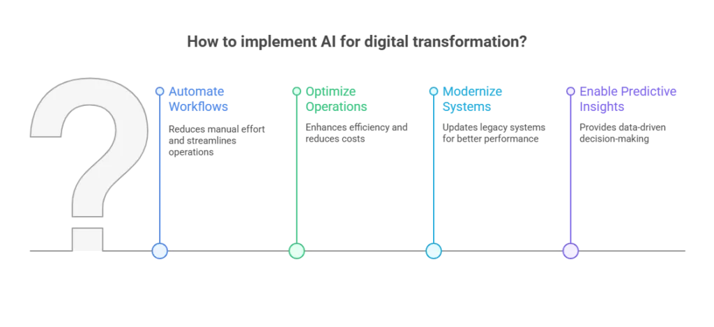 By automating workflows, optimizing operations, modernizing legacy systems, and enabling predictive insights.