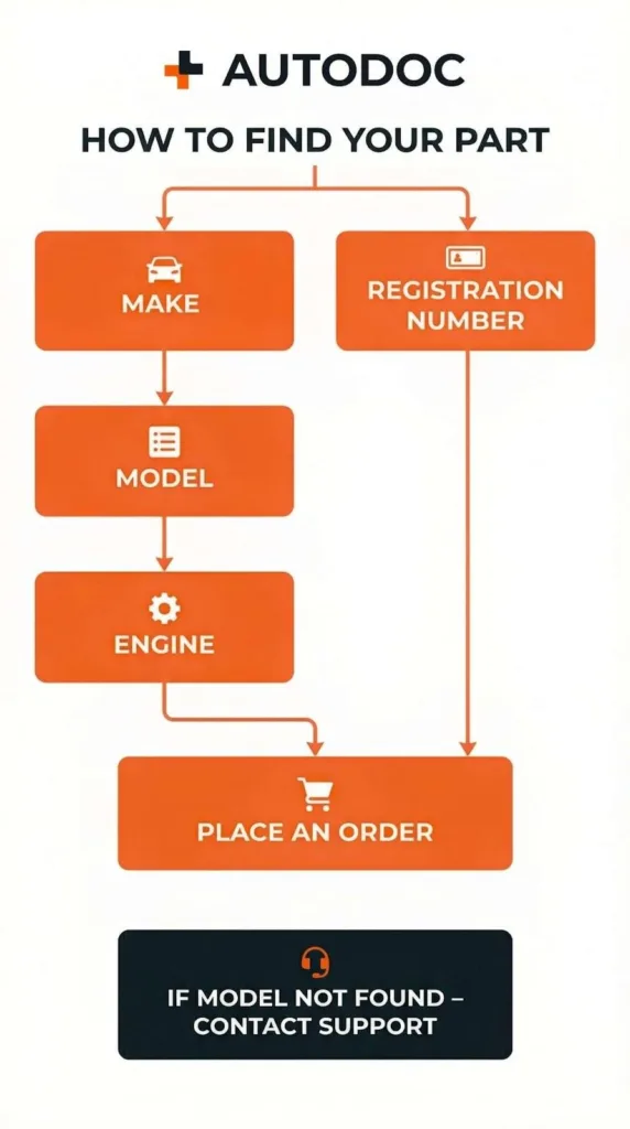 Compatibility errors are a hidden cause of delays in receiving items. When a part is ordered against an incorrect vehicle specification, the return and reorder cycle can add one to two weeks to the total wait. Most platforms, including AUTODOC, structure their search around make, model, and engine type, a sequence that filters out incompatible parts before checkout. Alternatively, entering a vehicle registration number pulls up the correct specification automatically. If a model is not found through either route, contacting platform support before ordering is faster than processing a return after the fact.